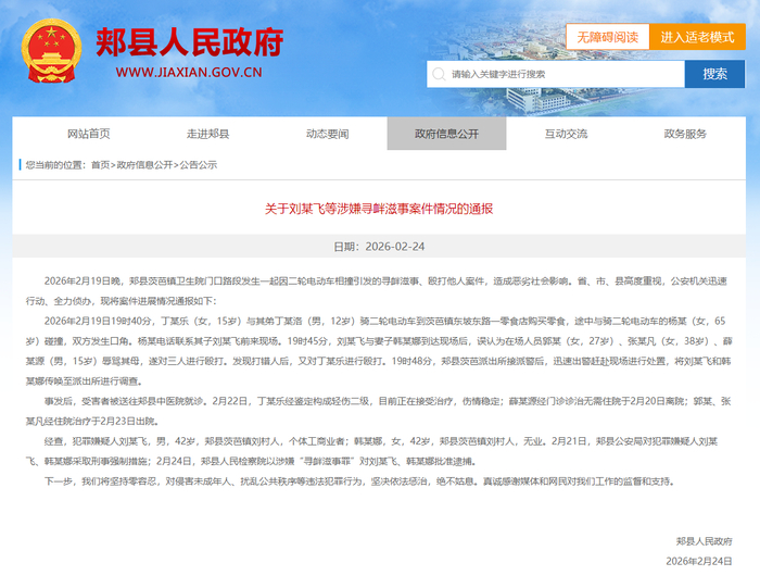 新京报讯 2月24日,河南郏县人民政府官网发布关于刘某飞等涉嫌寻衅滋事案件情况的通报,内容如下: