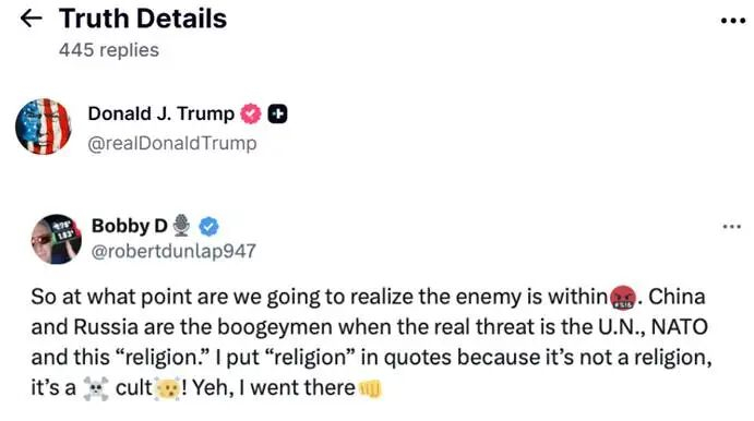 特朗普20日转发的这则帖子则对这种“威胁”说法予以否定。该帖子源于X平台,发帖人写道:“我们什么时候才能意识到敌人就在我们(美国)内部?俄罗斯和中国只是被妖魔化的假想敌,真正的威胁来自联合国、北约以及某个‘宗教’——它不是宗教,而是邪教。”